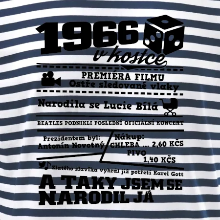 Narozeninové tričko pro ročník 1966. Sháníš originální dárek? Triko pro ročník 1966 v kostce je ten nejlepší dárek, kterým jistě potěšíš. Kolik co stálo? Kdo byl prezident? Kdo se narodil? Všechno tohle a ještě mnohem víc najdeš na našem oslaveneckém triku!