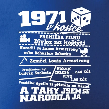 Narozeninové tričko pro ročník 1971. Sháníš originální dárek? Triko pro ročník 1971 v kostce je ten nejlepší dárek, kterým jistě potěšíš. Kolik co stálo? Kdo byl prezident? Kdo se narodil? Všechno tohle a ještě mnohem víc najdeš na našem oslaveneckém triku!