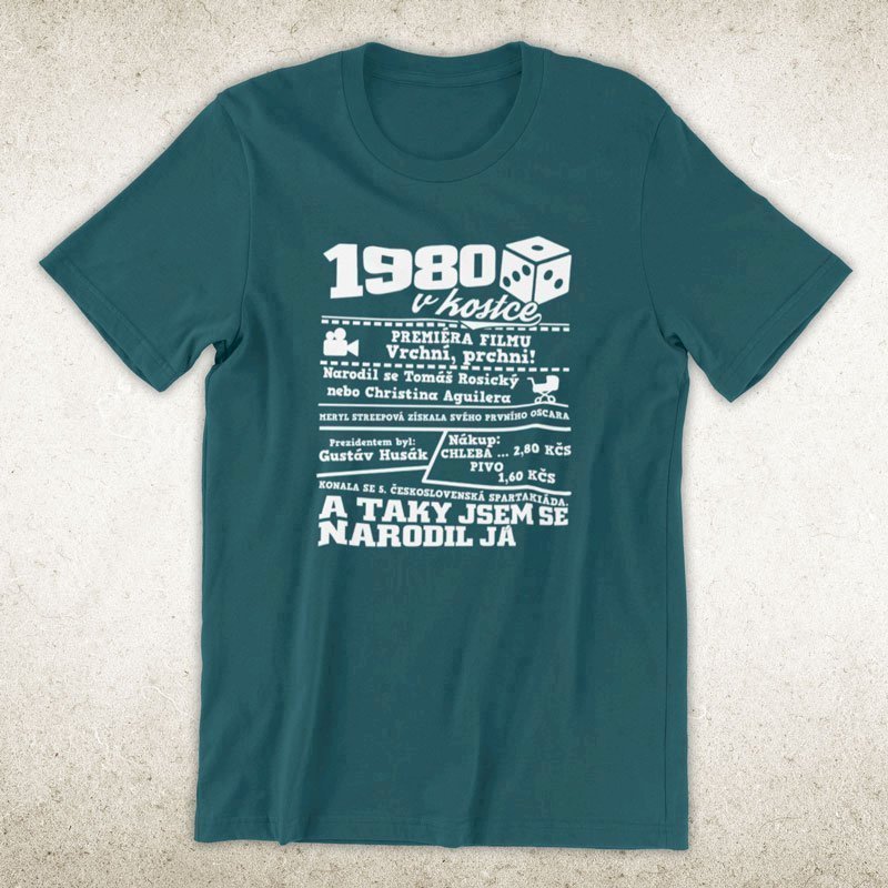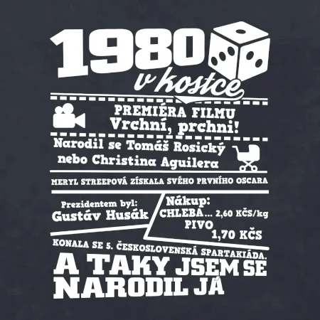 Narozeninové tričko pro ročník 1980. Sháníš originální dárek? Triko pro ročník 1980 v kostce je ten nejlepší dárek, kterým jistě potěšíš. Kolik co stálo? Kdo byl prezident? Kdo se narodil? Všechno tohle a ještě mnohem víc najdeš na našem oslaveneckém triku!