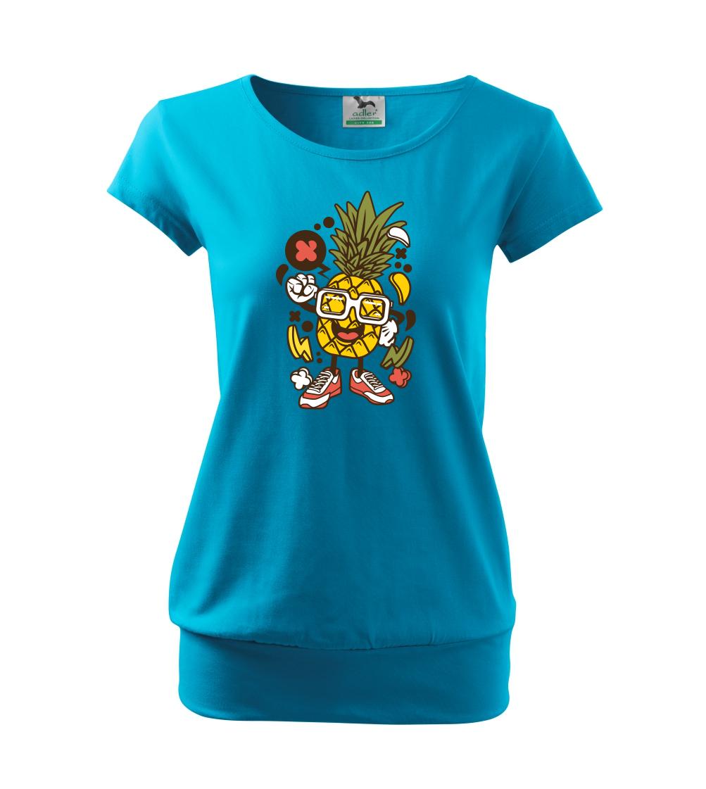 Trendové dámské triko s velmi krátkým rukávem, volnějšího střihu, v dolním kraji všité do širokého lemu. Kulatý průkrčník s úzkým lemem ze shodného materiálu.