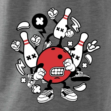 Triko pro hráče bowlingu, na kterém je bowlingová koule a kuželky. Bowlingové triko by měl mít každý bowlingový hráč. S bowlingovým trikem to bude samý strike, žádná kuželka neunikne!