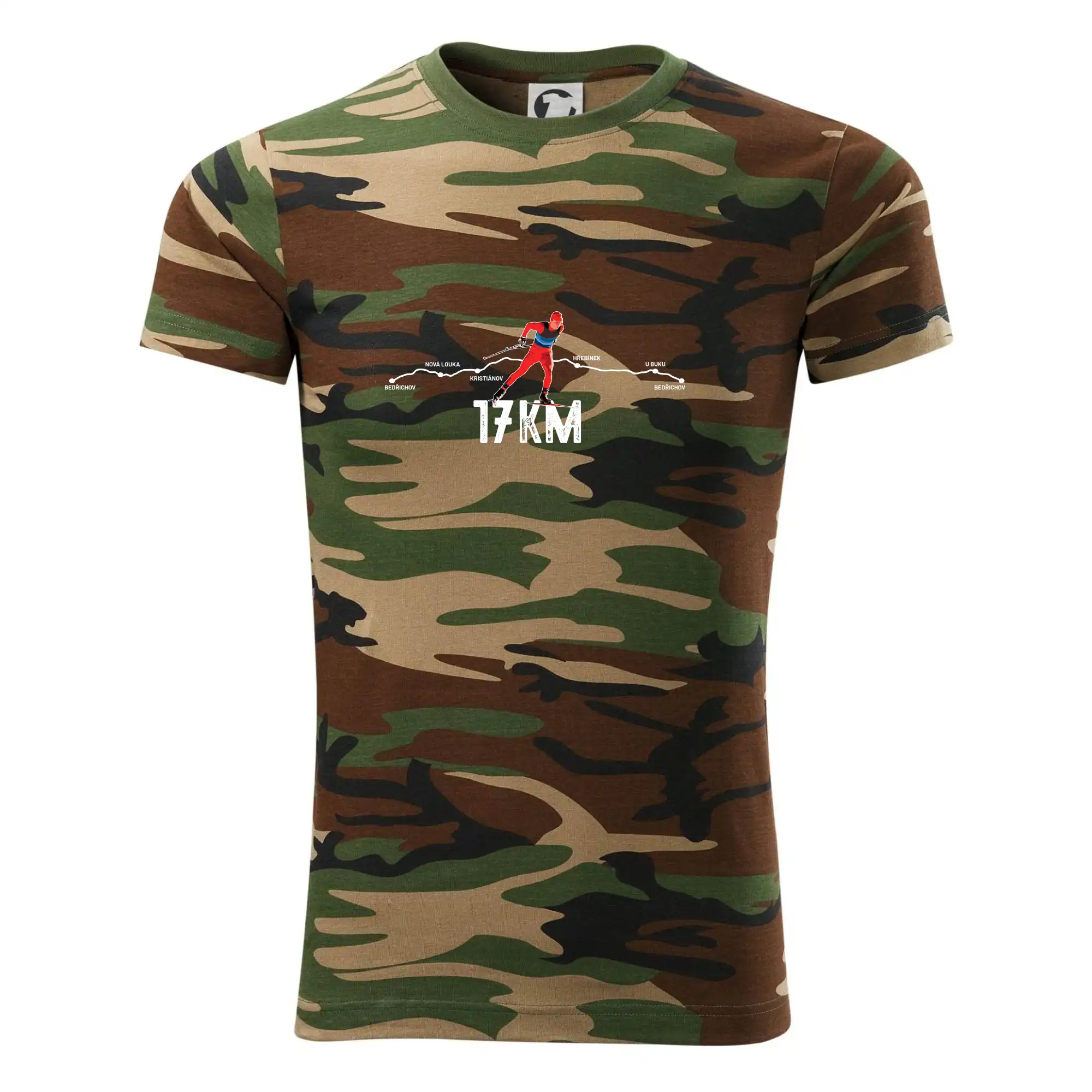 Tričko střední gramáže v barvách camouflage. Střih s bočními švy. Lem průkrčníku ze žebrového úpletu s přídavkem 5 % elastanu. Vnitřní část zadního průkrčníku začištěna páskou v barvě camouflage.
