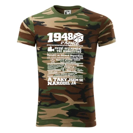 Tričko střední gramáže v barvách camouflage. Střih s bočními švy. Lem průkrčníku ze žebrového úpletu s přídavkem 5 % elastanu. Vnitřní část zadního průkrčníku začištěna páskou v barvě camouflage.