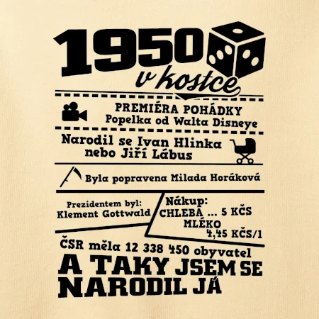 Narozeninové tričko pro ročník 1950. Sháníš originální dárek? Triko pro ročník 1950 v kostce je ten nejlepší dárek, kterým jistě potěšíš. Kolik co stálo? Kdo byl prezident? Kdo se narodil? Všechno tohle a ještě mnohem víc najdeš na našem oslaveneckém triku!