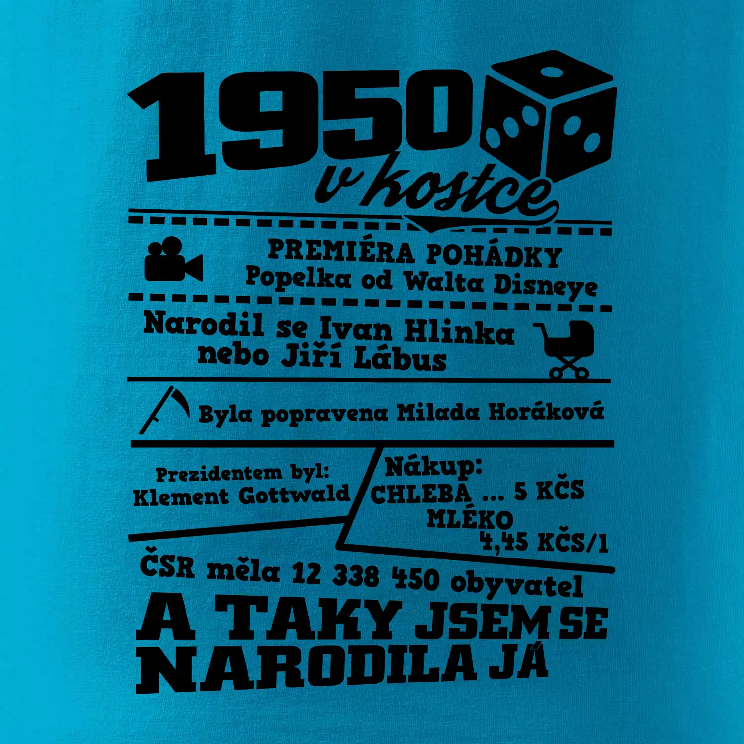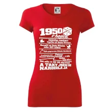Narozeninové tričko pro ročník 1950. Sháníš originální dárek? Triko pro ročník 1950 v kostce je ten nejlepší dárek, kterým jistě potěšíš. Kolik co stálo? Kdo byl prezident? Kdo se narodil? Všechno tohle a ještě mnohem víc najdeš na našem oslaveneckém triku!