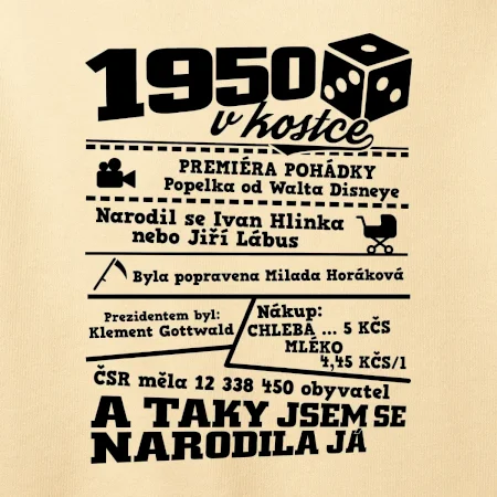 Narozeninové tričko pro ročník 1950. Sháníš originální dárek? Triko pro ročník 1950 v kostce je ten nejlepší dárek, kterým jistě potěšíš. Kolik co stálo? Kdo byl prezident? Kdo se narodil? Všechno tohle a ještě mnohem víc najdeš na našem oslaveneckém triku!