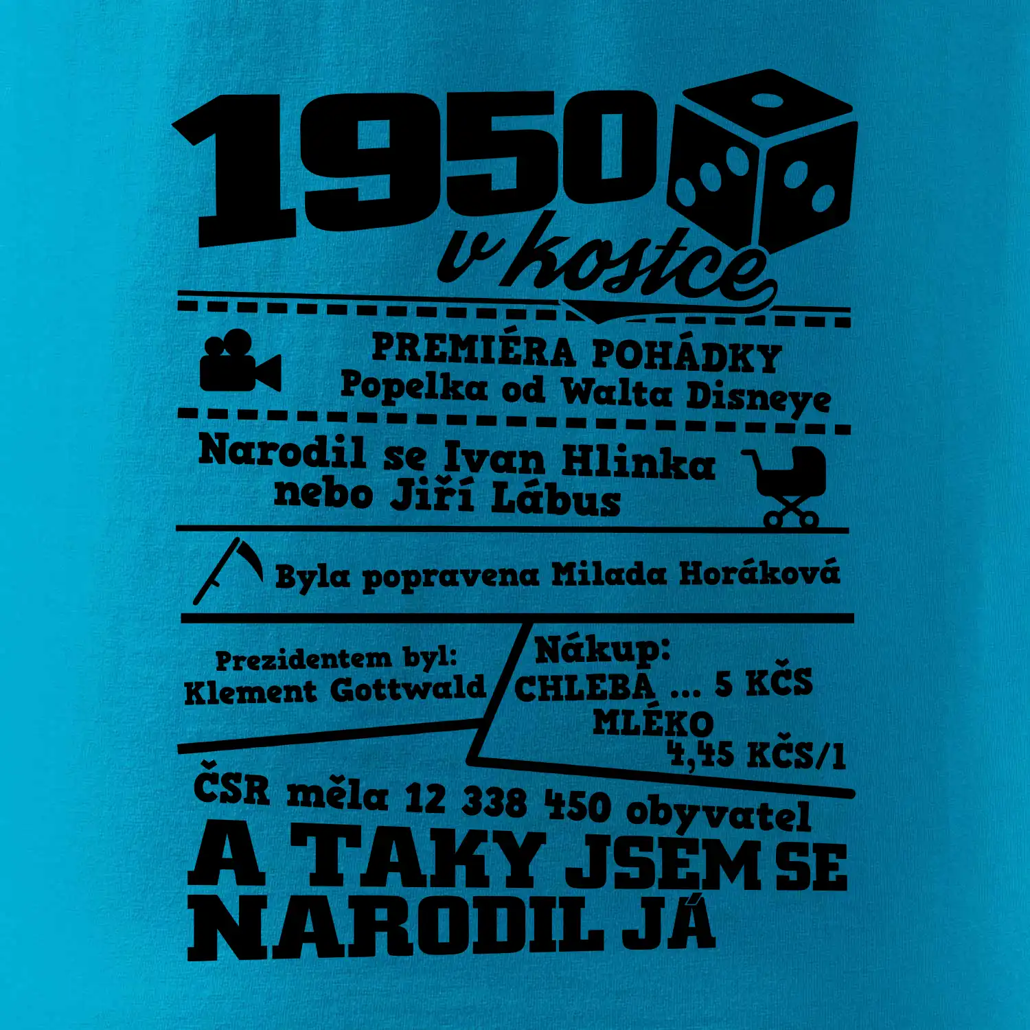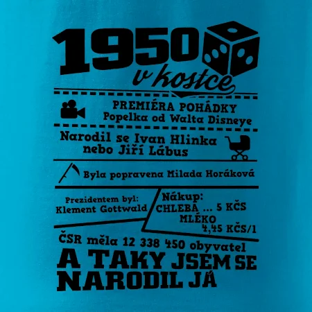 Narozeninové tričko pro ročník 1950. Sháníš originální dárek? Triko pro ročník 1950 v kostce je ten nejlepší dárek, kterým jistě potěšíš. Kolik co stálo? Kdo byl prezident? Kdo se narodil? Všechno tohle a ještě mnohem víc najdeš na našem oslaveneckém triku!