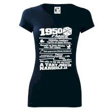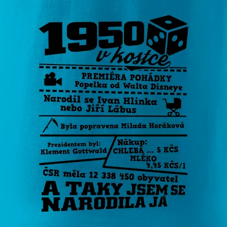 Narozeninové tričko pro ročník 1950. Sháníš originální dárek? Triko pro ročník 1950 v kostce je ten nejlepší dárek, kterým jistě potěšíš. Kolik co stálo? Kdo byl prezident? Kdo se narodil? Všechno tohle a ještě mnohem víc najdeš na našem oslaveneckém triku!