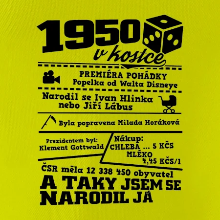 Narozeninové tričko pro ročník 1950. Sháníš originální dárek? Triko pro ročník 1950 v kostce je ten nejlepší dárek, kterým jistě potěšíš. Kolik co stálo? Kdo byl prezident? Kdo se narodil? Všechno tohle a ještě mnohem víc najdeš na našem oslaveneckém triku!