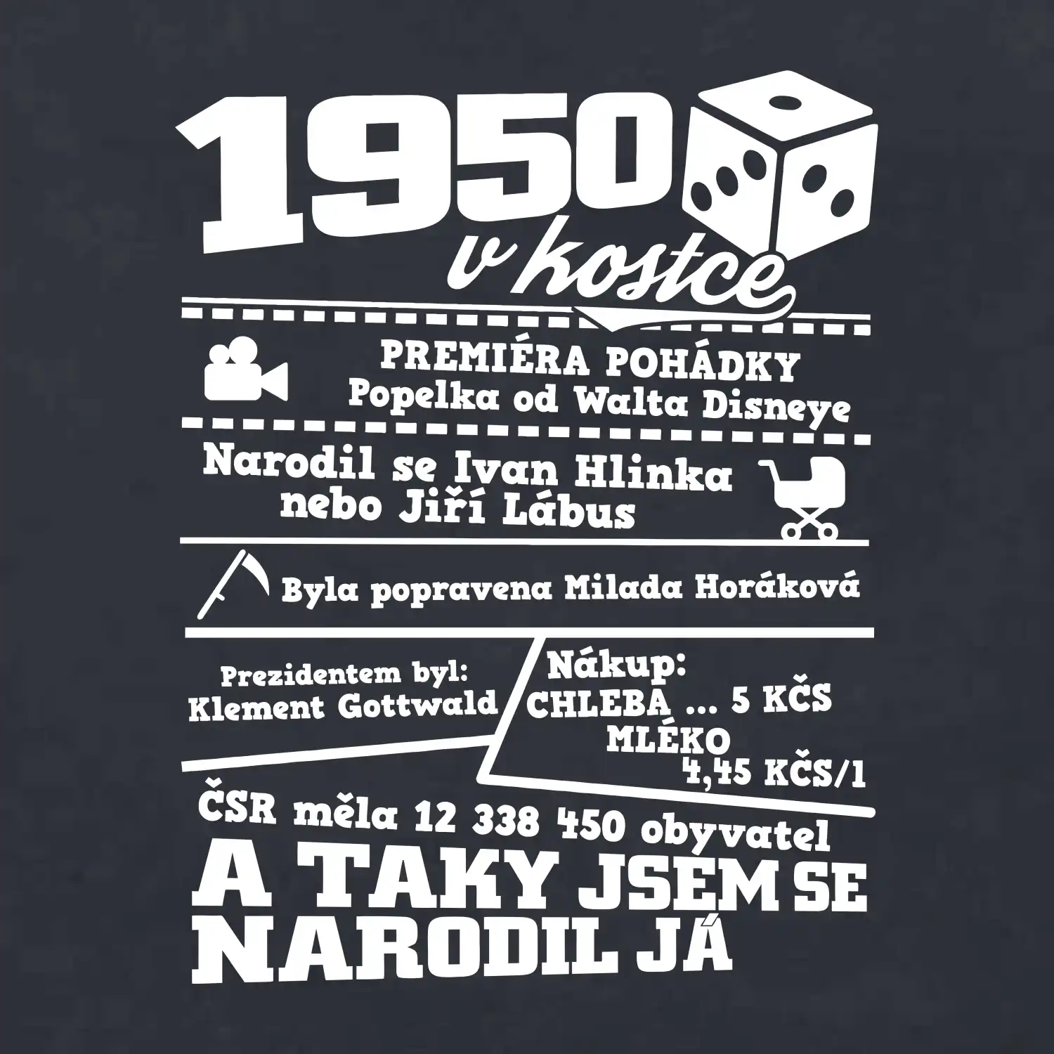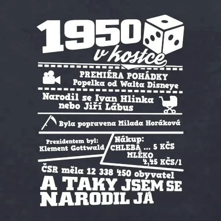 Narozeninové tričko pro ročník 1950. Sháníš originální dárek? Triko pro ročník 1950 v kostce je ten nejlepší dárek, kterým jistě potěšíš. Kolik co stálo? Kdo byl prezident? Kdo se narodil? Všechno tohle a ještě mnohem víc najdeš na našem oslaveneckém triku!