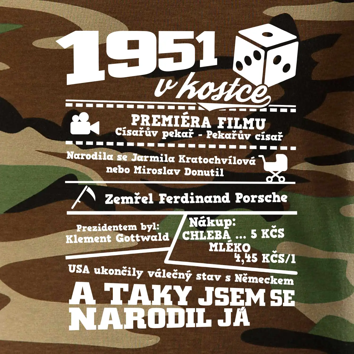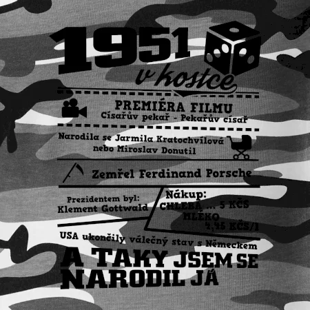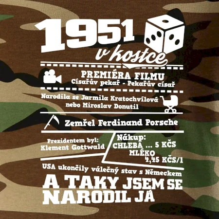 Narozeninové tričko pro ročník 1951. Sháníš originální dárek? Triko pro ročník 1951 v kostce je ten nejlepší dárek, kterým jistě potěšíš. Kolik co stálo? Kdo byl prezident? Kdo se narodil? Všechno tohle a ještě mnohem víc najdeš na našem oslaveneckém triku!
