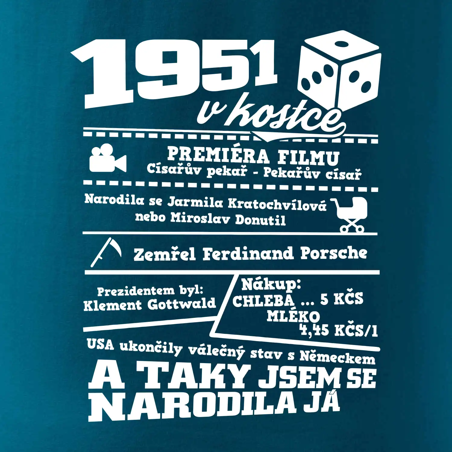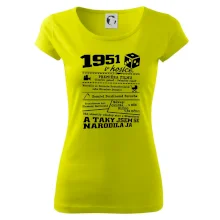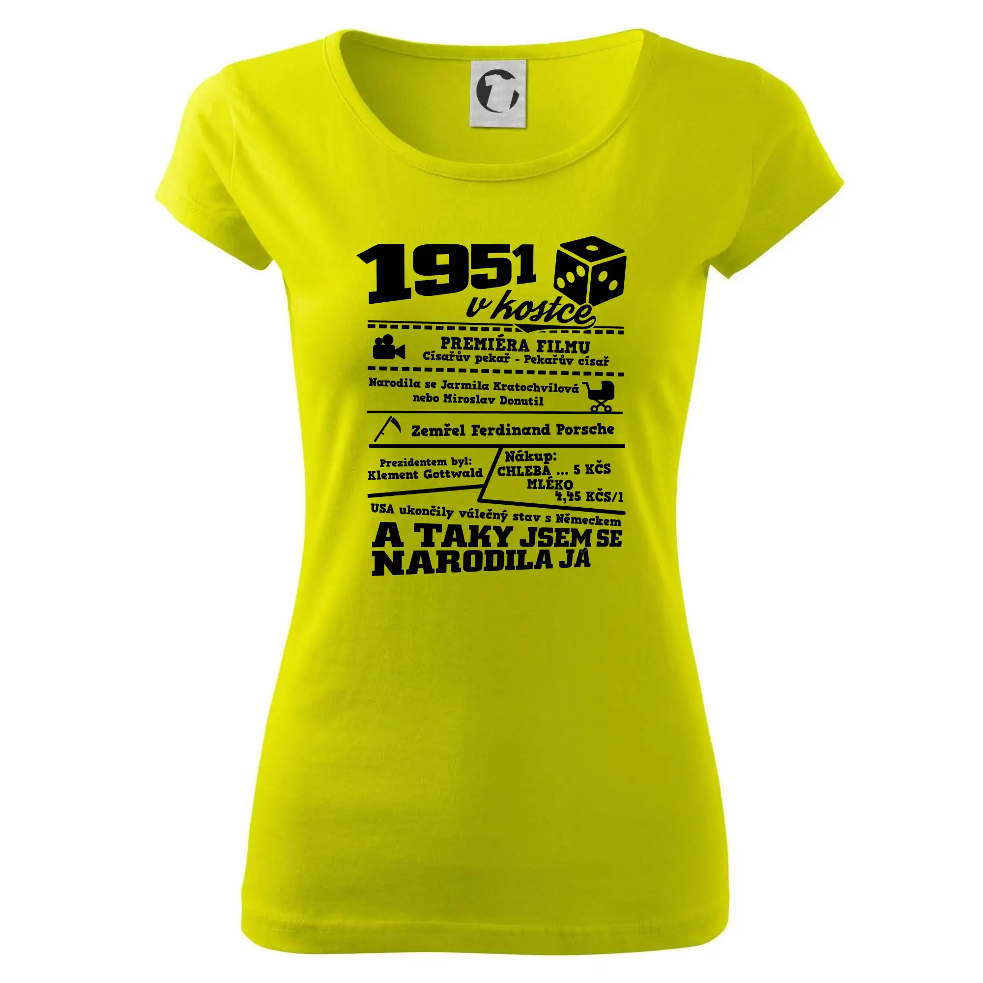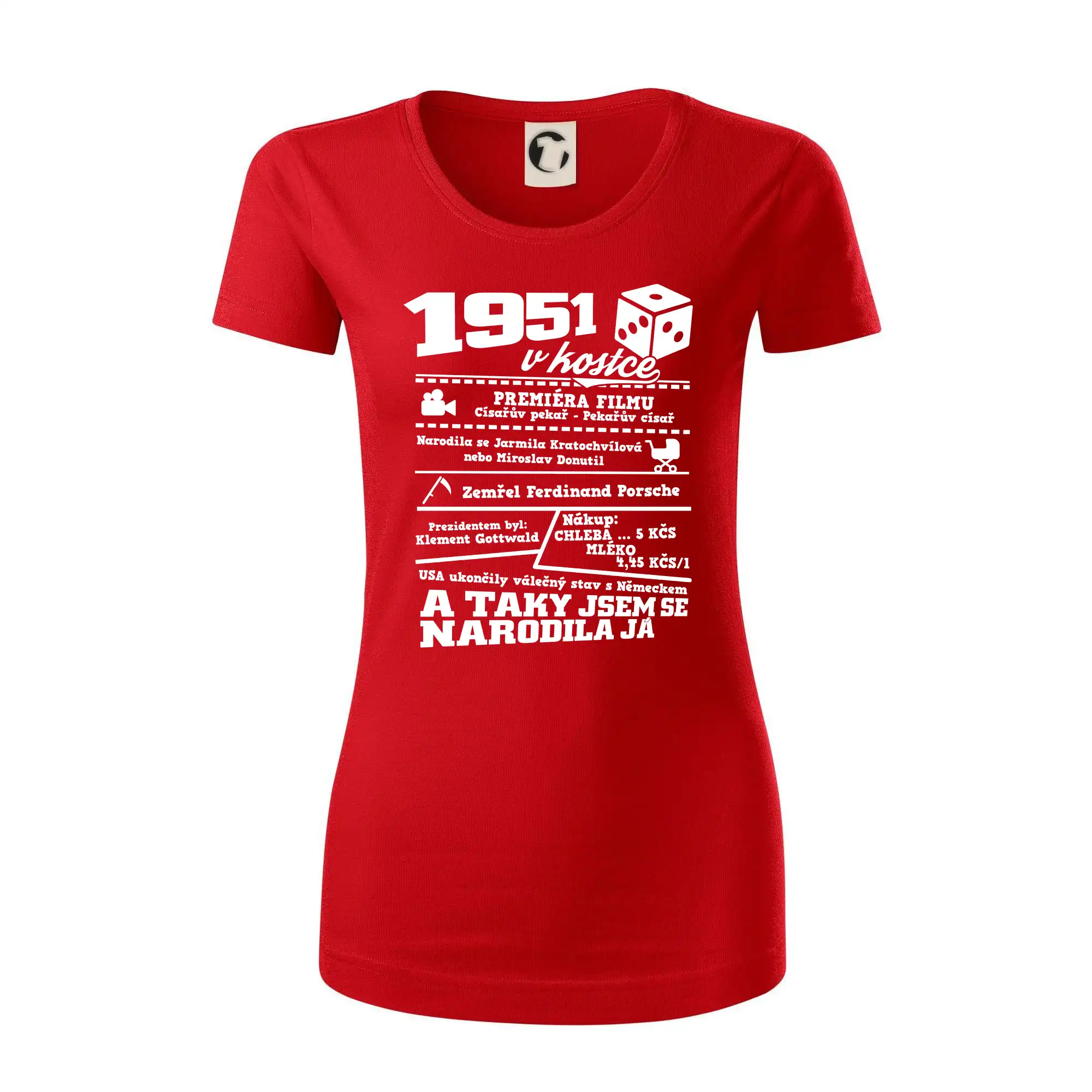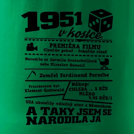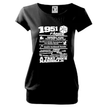 Narozeninové tričko pro ročník 1951. Sháníš originální dárek? Triko pro ročník 1951 v kostce je ten nejlepší dárek, kterým jistě potěšíš. Kolik co stálo? Kdo byl prezident? Kdo se narodil? Všechno tohle a ještě mnohem víc najdeš na našem oslaveneckém triku!