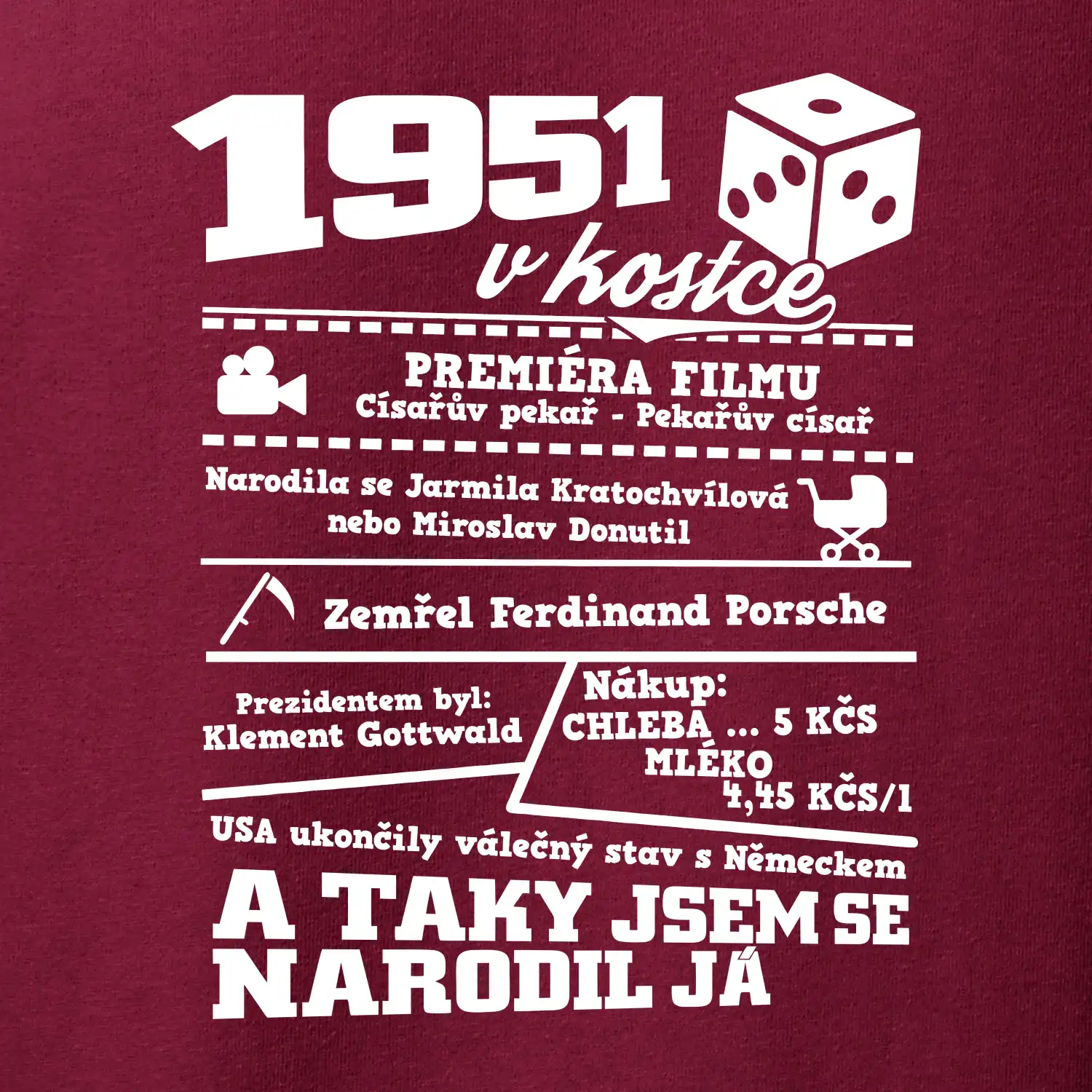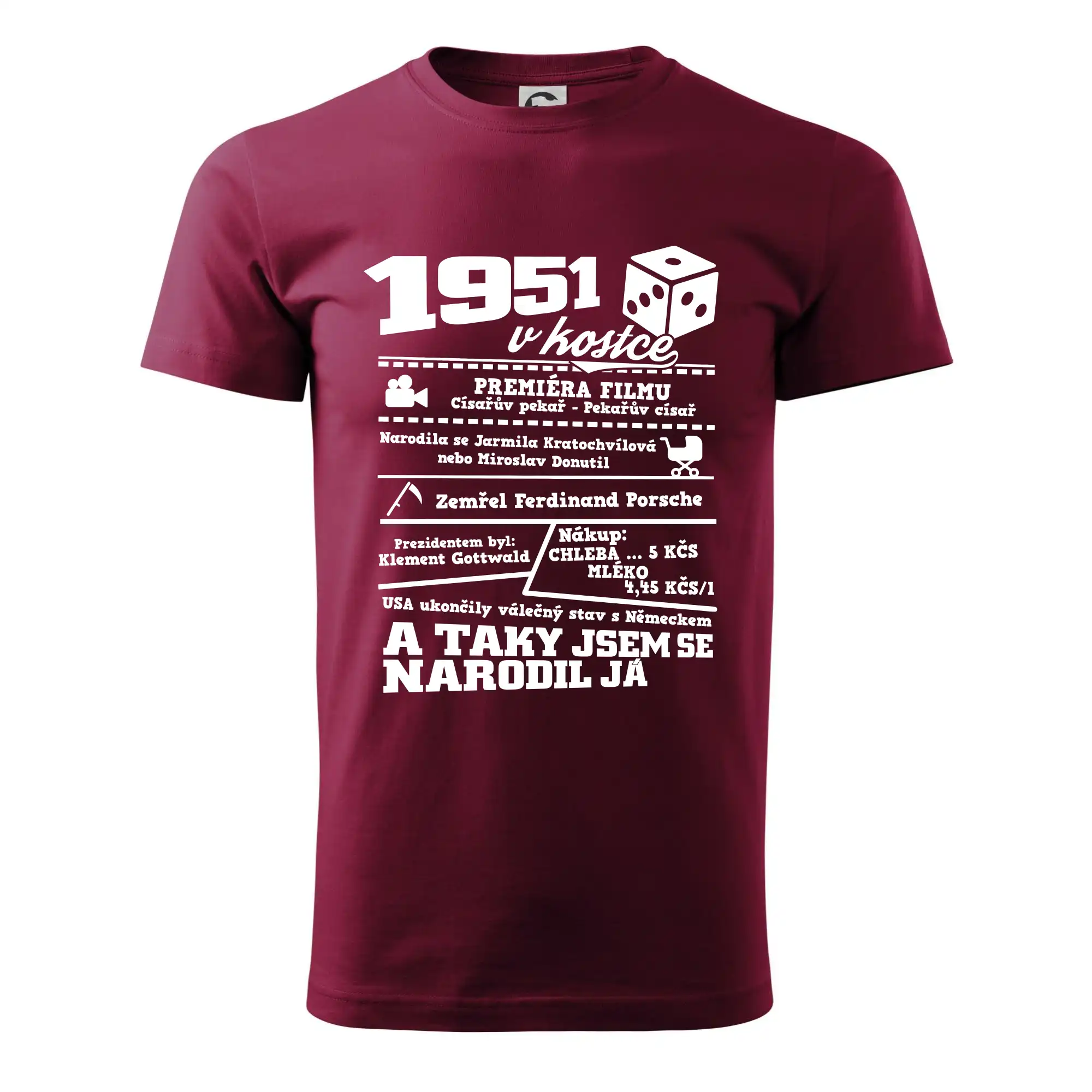 Narozeninové tričko pro ročník 1951. Sháníš originální dárek? Triko pro ročník 1951 v kostce je ten nejlepší dárek, kterým jistě potěšíš. Kolik co stálo? Kdo byl prezident? Kdo se narodil? Všechno tohle a ještě mnohem víc najdeš na našem oslaveneckém triku!