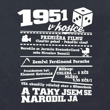Narozeninové tričko pro ročník 1951. Sháníš originální dárek? Triko pro ročník 1951 v kostce je ten nejlepší dárek, kterým jistě potěšíš. Kolik co stálo? Kdo byl prezident? Kdo se narodil? Všechno tohle a ještě mnohem víc najdeš na našem oslaveneckém triku!