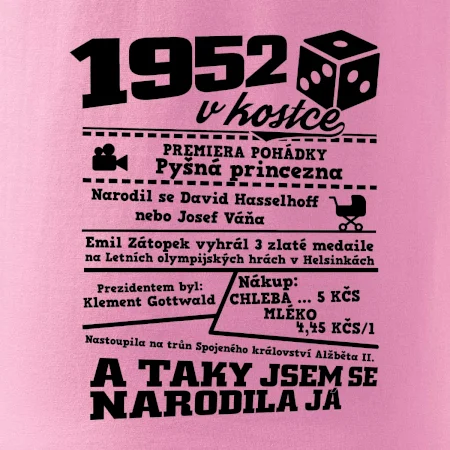 Narozeninové tričko pro ročník 1952. Sháníš originální dárek? Triko pro ročník 1952 v kostce je ten nejlepší dárek, kterým jistě potěšíš. Kolik co stálo? Kdo byl prezident? Kdo se narodil? Všechno tohle a ještě mnohem víc najdeš na našem oslaveneckém triku!