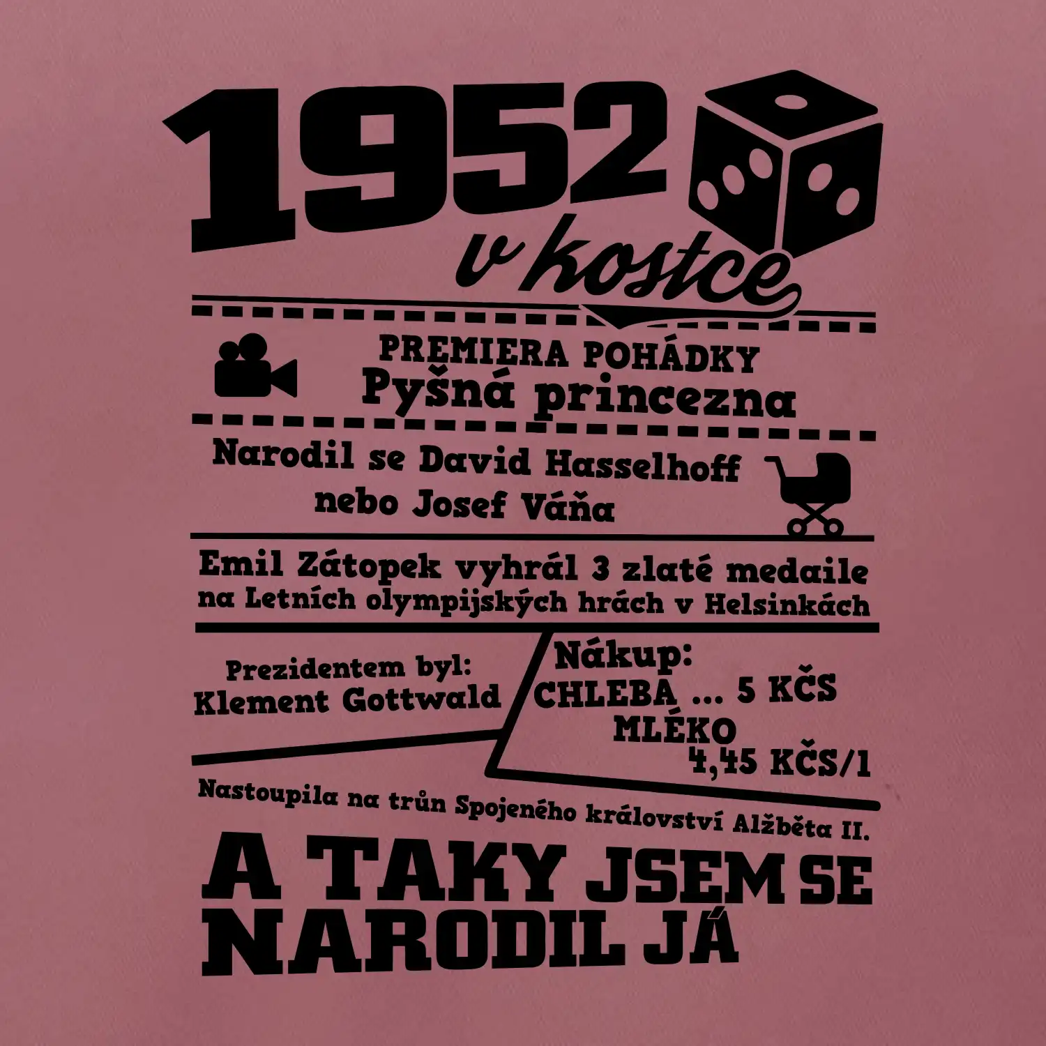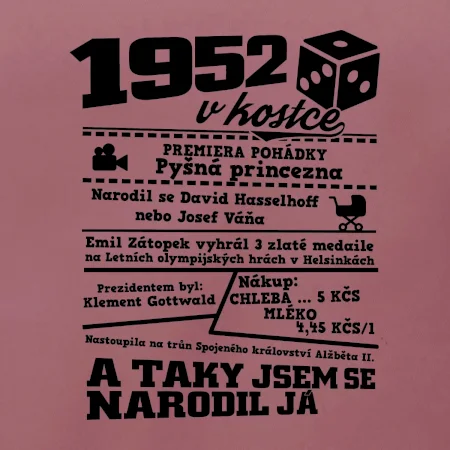 Narozeninové tričko pro ročník 1952. Sháníš originální dárek? Triko pro ročník 1952 v kostce je ten nejlepší dárek, kterým jistě potěšíš. Kolik co stálo? Kdo byl prezident? Kdo se narodil? Všechno tohle a ještě mnohem víc najdeš na našem oslaveneckém triku!