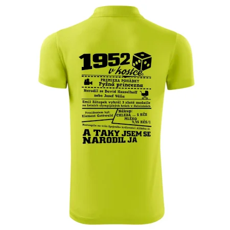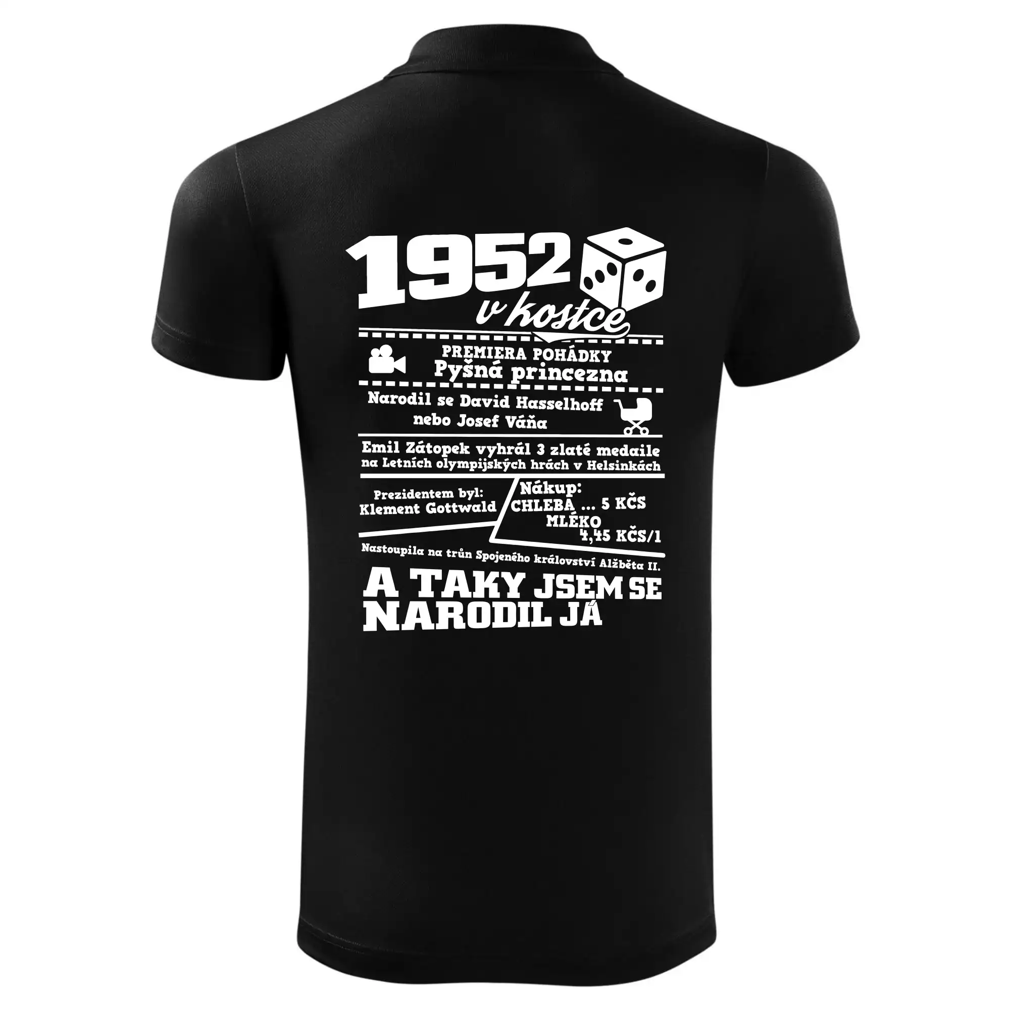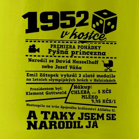 Narozeninové tričko pro ročník 1952. Sháníš originální dárek? Triko pro ročník 1952 v kostce je ten nejlepší dárek, kterým jistě potěšíš. Kolik co stálo? Kdo byl prezident? Kdo se narodil? Všechno tohle a ještě mnohem víc najdeš na našem oslaveneckém triku!