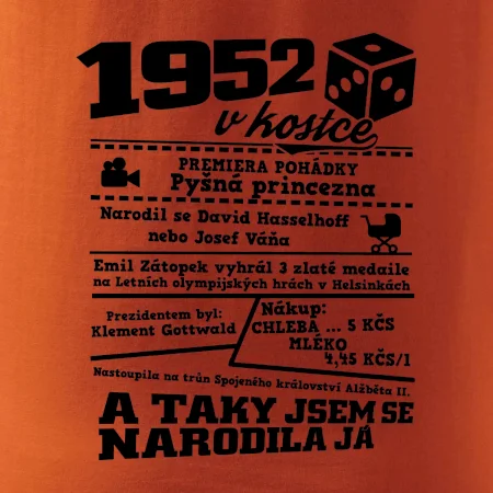 Narozeninové tričko pro ročník 1952. Sháníš originální dárek? Triko pro ročník 1952 v kostce je ten nejlepší dárek, kterým jistě potěšíš. Kolik co stálo? Kdo byl prezident? Kdo se narodil? Všechno tohle a ještě mnohem víc najdeš na našem oslaveneckém triku!