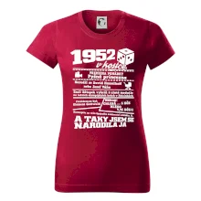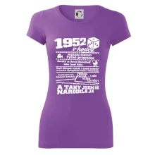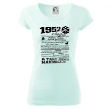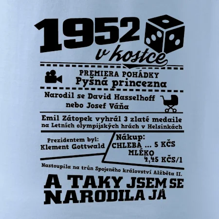 Narozeninové tričko pro ročník 1952. Sháníš originální dárek? Triko pro ročník 1952 v kostce je ten nejlepší dárek, kterým jistě potěšíš. Kolik co stálo? Kdo byl prezident? Kdo se narodil? Všechno tohle a ještě mnohem víc najdeš na našem oslaveneckém triku!
