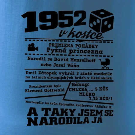 Narozeninové tričko pro ročník 1952. Sháníš originální dárek? Triko pro ročník 1952 v kostce je ten nejlepší dárek, kterým jistě potěšíš. Kolik co stálo? Kdo byl prezident? Kdo se narodil? Všechno tohle a ještě mnohem víc najdeš na našem oslaveneckém triku!