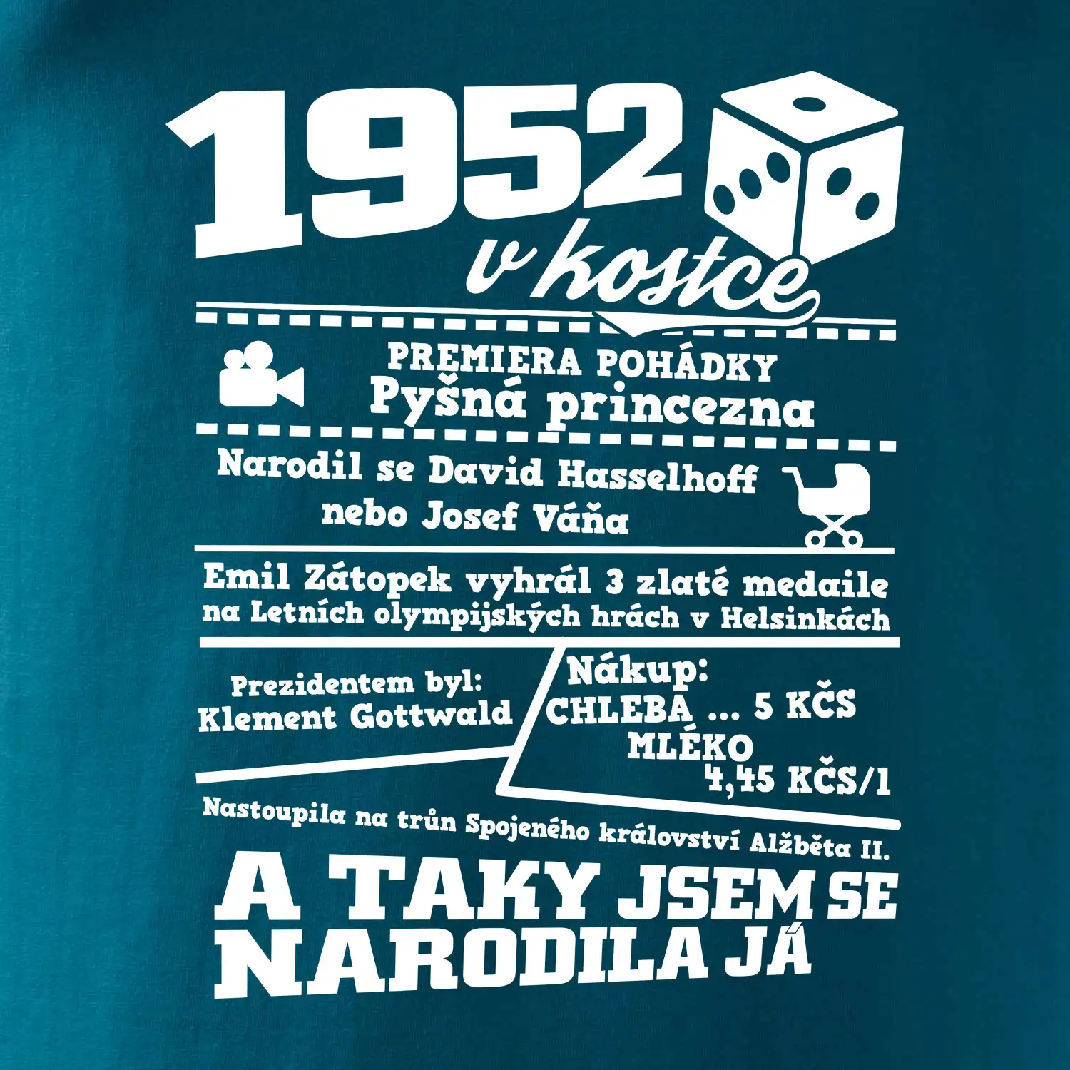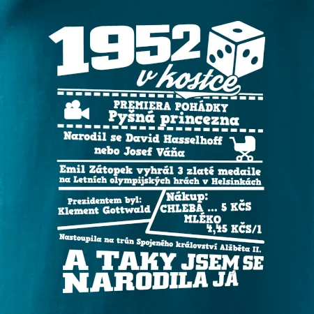 Narozeninové tričko pro ročník 1952. Sháníš originální dárek? Triko pro ročník 1952 v kostce je ten nejlepší dárek, kterým jistě potěšíš. Kolik co stálo? Kdo byl prezident? Kdo se narodil? Všechno tohle a ještě mnohem víc najdeš na našem oslaveneckém triku!