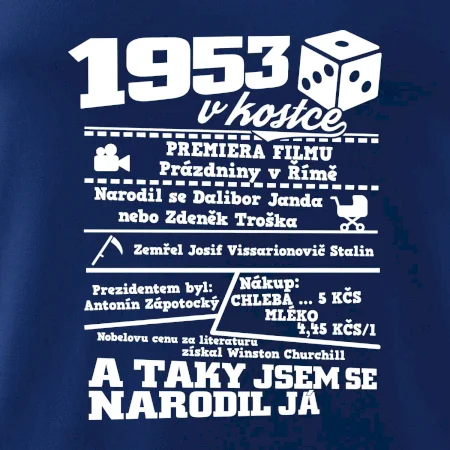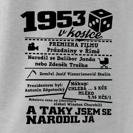 Narozeninové tričko pro ročník 1953. Sháníš originální dárek? Triko pro ročník 1953 v kostce je ten nejlepší dárek, kterým jistě potěšíš. Kolik co stálo? Kdo byl prezident? Kdo se narodil? Všechno tohle a ještě mnohem víc najdeš na našem oslaveneckém triku!