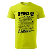 Narozeninové tričko pro ročník 1953. Sháníš originální dárek? Triko pro ročník 1953 v kostce je ten nejlepší dárek, kterým jistě potěšíš. Kolik co stálo? Kdo byl prezident? Kdo se narodil? Všechno tohle a ještě mnohem víc najdeš na našem oslaveneckém triku!