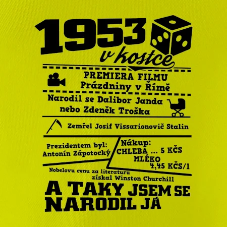 Narozeninové tričko pro ročník 1953. Sháníš originální dárek? Triko pro ročník 1953 v kostce je ten nejlepší dárek, kterým jistě potěšíš. Kolik co stálo? Kdo byl prezident? Kdo se narodil? Všechno tohle a ještě mnohem víc najdeš na našem oslaveneckém triku!