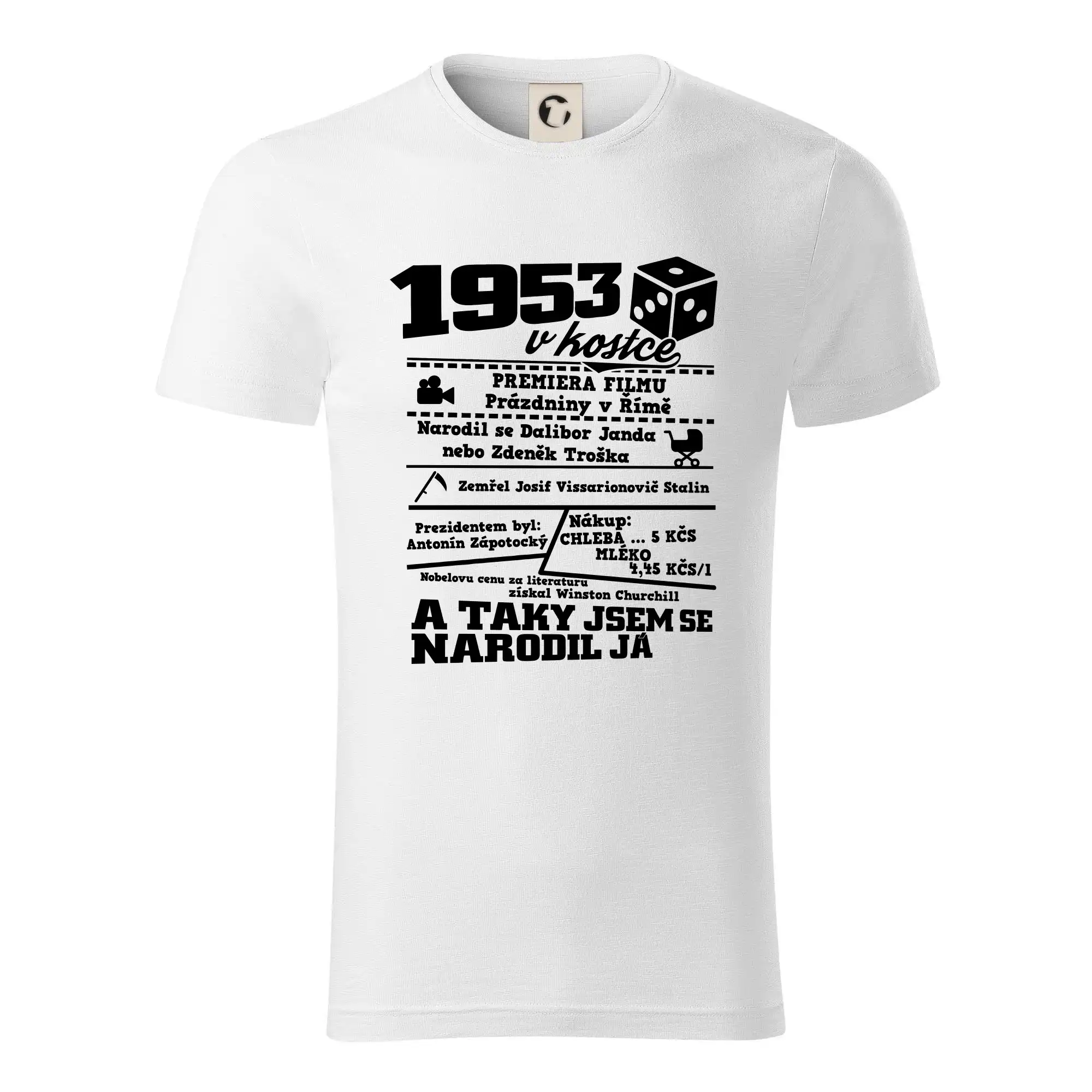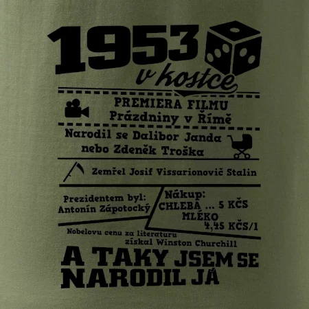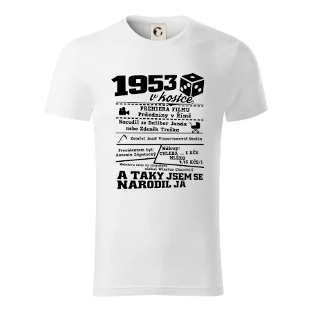 Narozeninové tričko pro ročník 1953. Sháníš originální dárek? Triko pro ročník 1953 v kostce je ten nejlepší dárek, kterým jistě potěšíš. Kolik co stálo? Kdo byl prezident? Kdo se narodil? Všechno tohle a ještě mnohem víc najdeš na našem oslaveneckém triku!