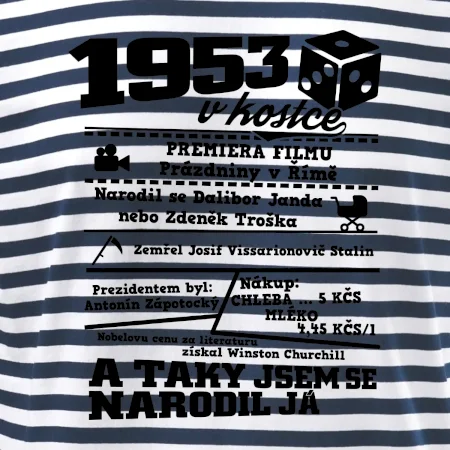 Narozeninové tričko pro ročník 1953. Sháníš originální dárek? Triko pro ročník 1953 v kostce je ten nejlepší dárek, kterým jistě potěšíš. Kolik co stálo? Kdo byl prezident? Kdo se narodil? Všechno tohle a ještě mnohem víc najdeš na našem oslaveneckém triku!