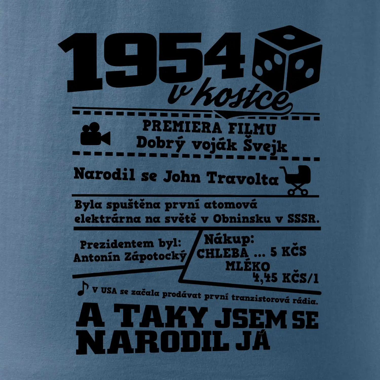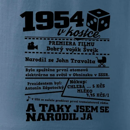 Narozeninové tričko pro ročník 1954. Sháníš originální dárek? Triko pro ročník 1954 v kostce je ten nejlepší dárek, kterým jistě potěšíš. Kolik co stálo? Kdo byl prezident? Kdo se narodil? Všechno tohle a ještě mnohem víc najdeš na našem oslaveneckém triku!