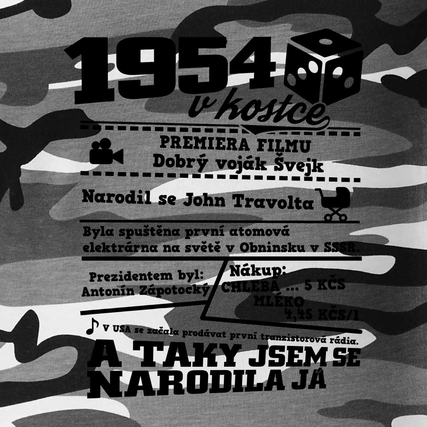 Narozeninové tričko pro ročník 1954. Sháníš originální dárek? Triko pro ročník 1954 v kostce je ten nejlepší dárek, kterým jistě potěšíš. Kolik co stálo? Kdo byl prezident? Kdo se narodil? Všechno tohle a ještě mnohem víc najdeš na našem oslaveneckém triku!
