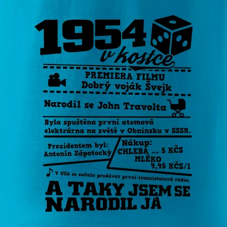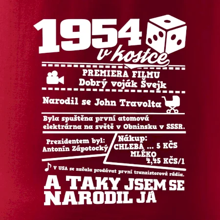 Narozeninové tričko pro ročník 1954. Sháníš originální dárek? Triko pro ročník 1954 v kostce je ten nejlepší dárek, kterým jistě potěšíš. Kolik co stálo? Kdo byl prezident? Kdo se narodil? Všechno tohle a ještě mnohem víc najdeš na našem oslaveneckém triku!