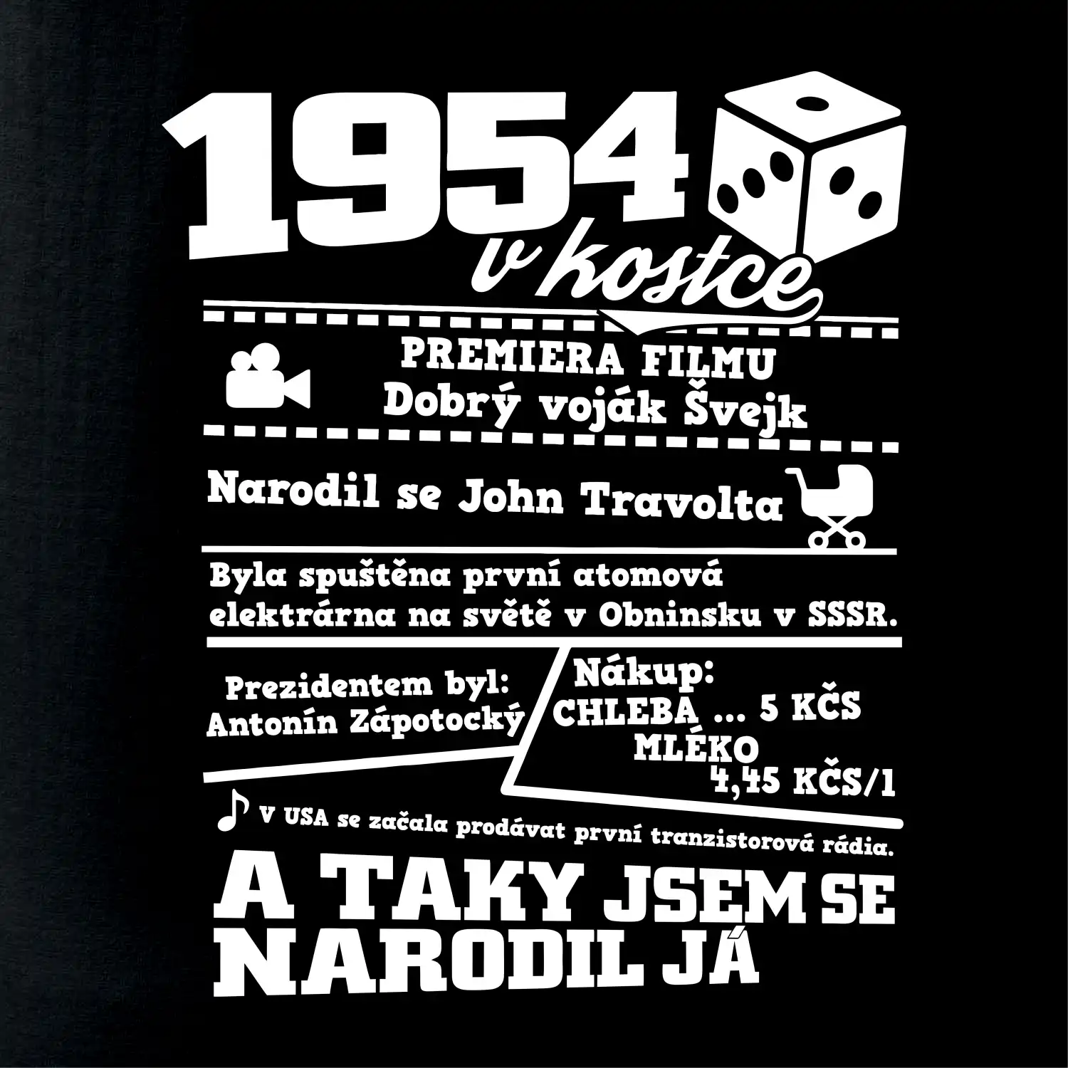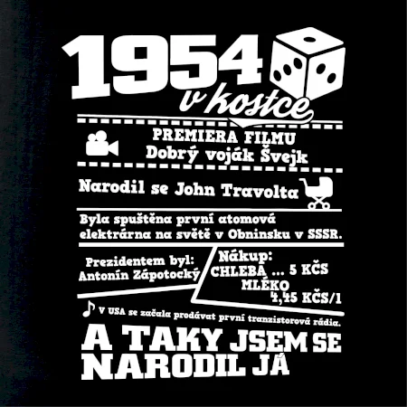 Narozeninové tričko pro ročník 1954. Sháníš originální dárek? Triko pro ročník 1954 v kostce je ten nejlepší dárek, kterým jistě potěšíš. Kolik co stálo? Kdo byl prezident? Kdo se narodil? Všechno tohle a ještě mnohem víc najdeš na našem oslaveneckém triku!