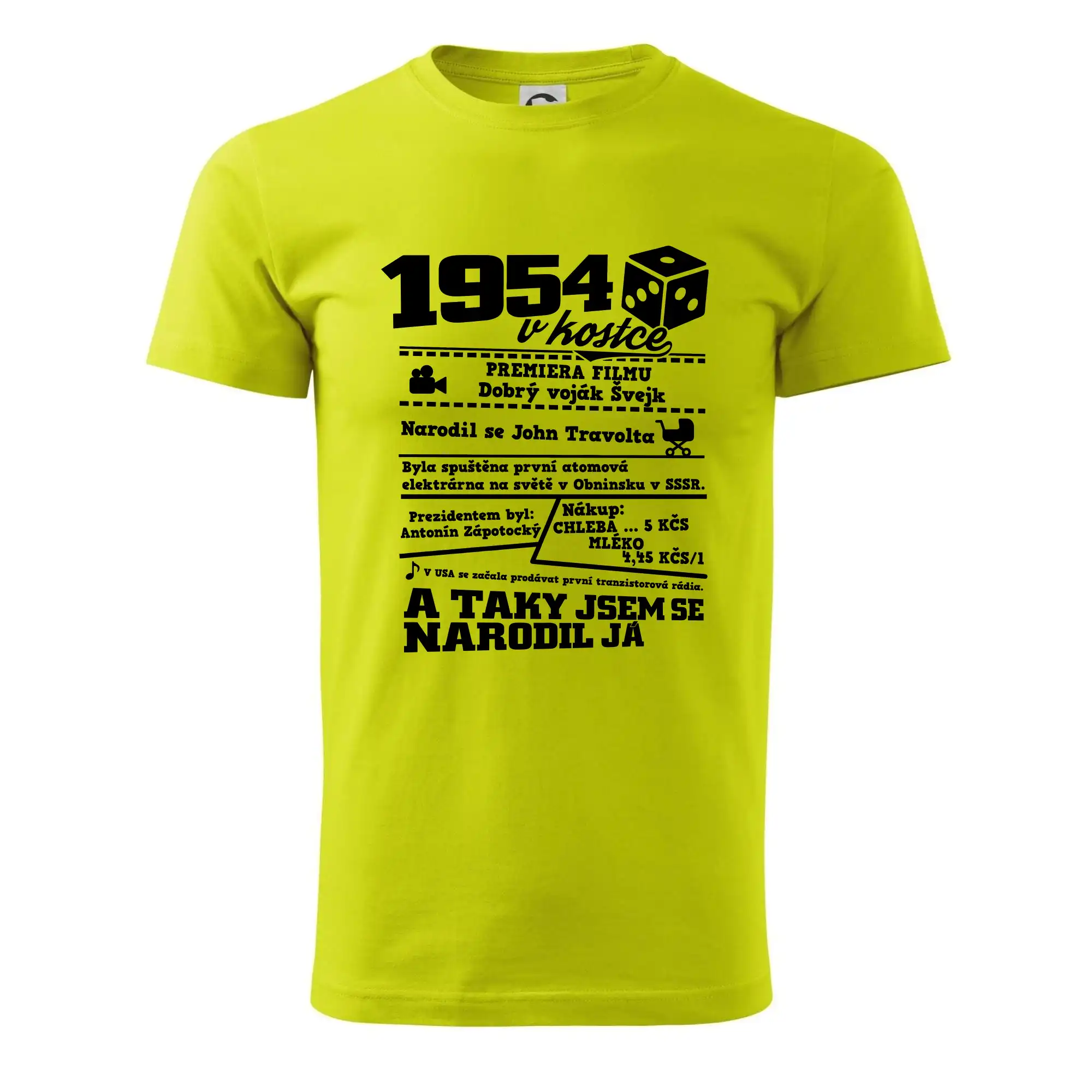 Narozeninové tričko pro ročník 1954. Sháníš originální dárek? Triko pro ročník 1954 v kostce je ten nejlepší dárek, kterým jistě potěšíš. Kolik co stálo? Kdo byl prezident? Kdo se narodil? Všechno tohle a ještě mnohem víc najdeš na našem oslaveneckém triku!