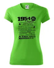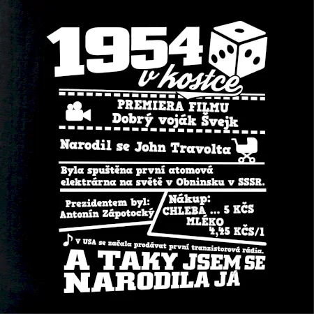 Narozeninové tričko pro ročník 1954. Sháníš originální dárek? Triko pro ročník 1954 v kostce je ten nejlepší dárek, kterým jistě potěšíš. Kolik co stálo? Kdo byl prezident? Kdo se narodil? Všechno tohle a ještě mnohem víc najdeš na našem oslaveneckém triku!