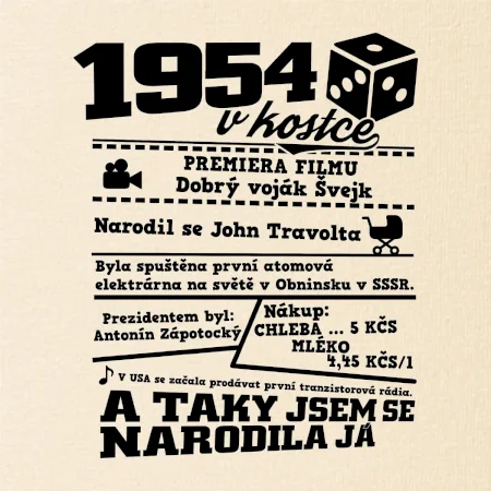 Narozeninové tričko pro ročník 1954. Sháníš originální dárek? Triko pro ročník 1954 v kostce je ten nejlepší dárek, kterým jistě potěšíš. Kolik co stálo? Kdo byl prezident? Kdo se narodil? Všechno tohle a ještě mnohem víc najdeš na našem oslaveneckém triku!
