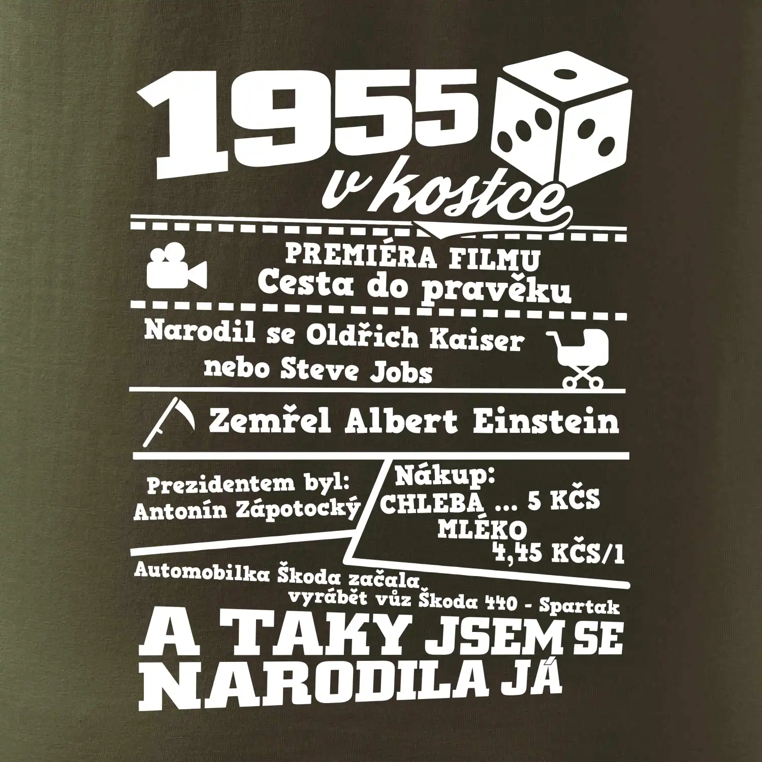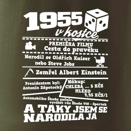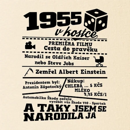 Narozeninové tričko pro ročník 1955. Sháníš originální dárek? Triko pro ročník 1955 v kostce je ten nejlepší dárek, kterým jistě potěšíš. Kolik co stálo? Kdo byl prezident? Kdo se narodil? Všechno tohle a ještě mnohem víc najdeš na našem oslaveneckém triku!