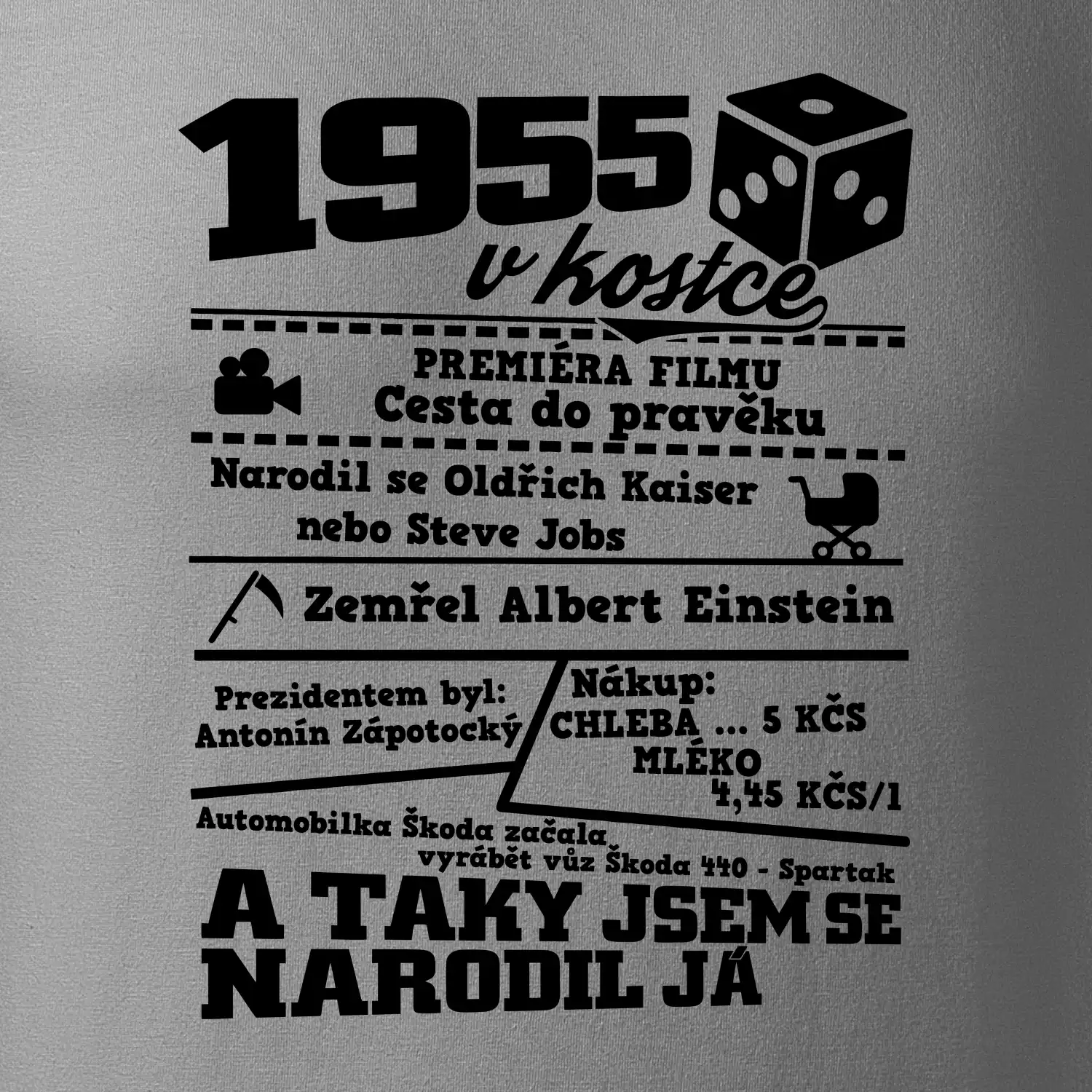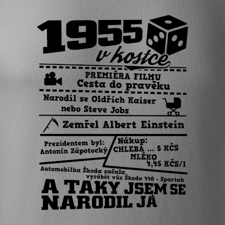 Narozeninové tričko pro ročník 1955. Sháníš originální dárek? Triko pro ročník 1955 v kostce je ten nejlepší dárek, kterým jistě potěšíš. Kolik co stálo? Kdo byl prezident? Kdo se narodil? Všechno tohle a ještě mnohem víc najdeš na našem oslaveneckém triku!