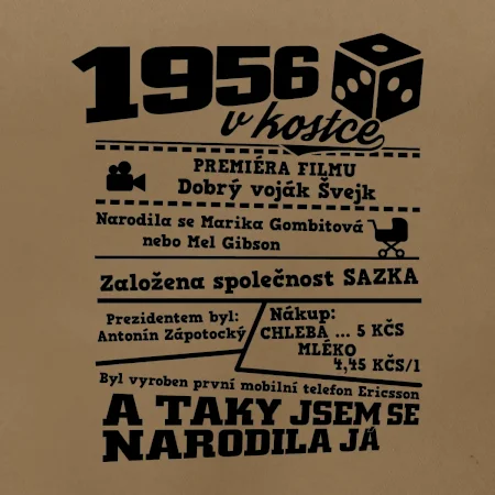 Narozeninové tričko pro ročník 1956. Sháníš originální dárek? Triko pro ročník 1956 v kostce je ten nejlepší dárek, kterým jistě potěšíš. Kolik co stálo? Kdo byl prezident? Kdo se narodil? Všechno tohle a ještě mnohem víc najdeš na našem oslaveneckém triku!