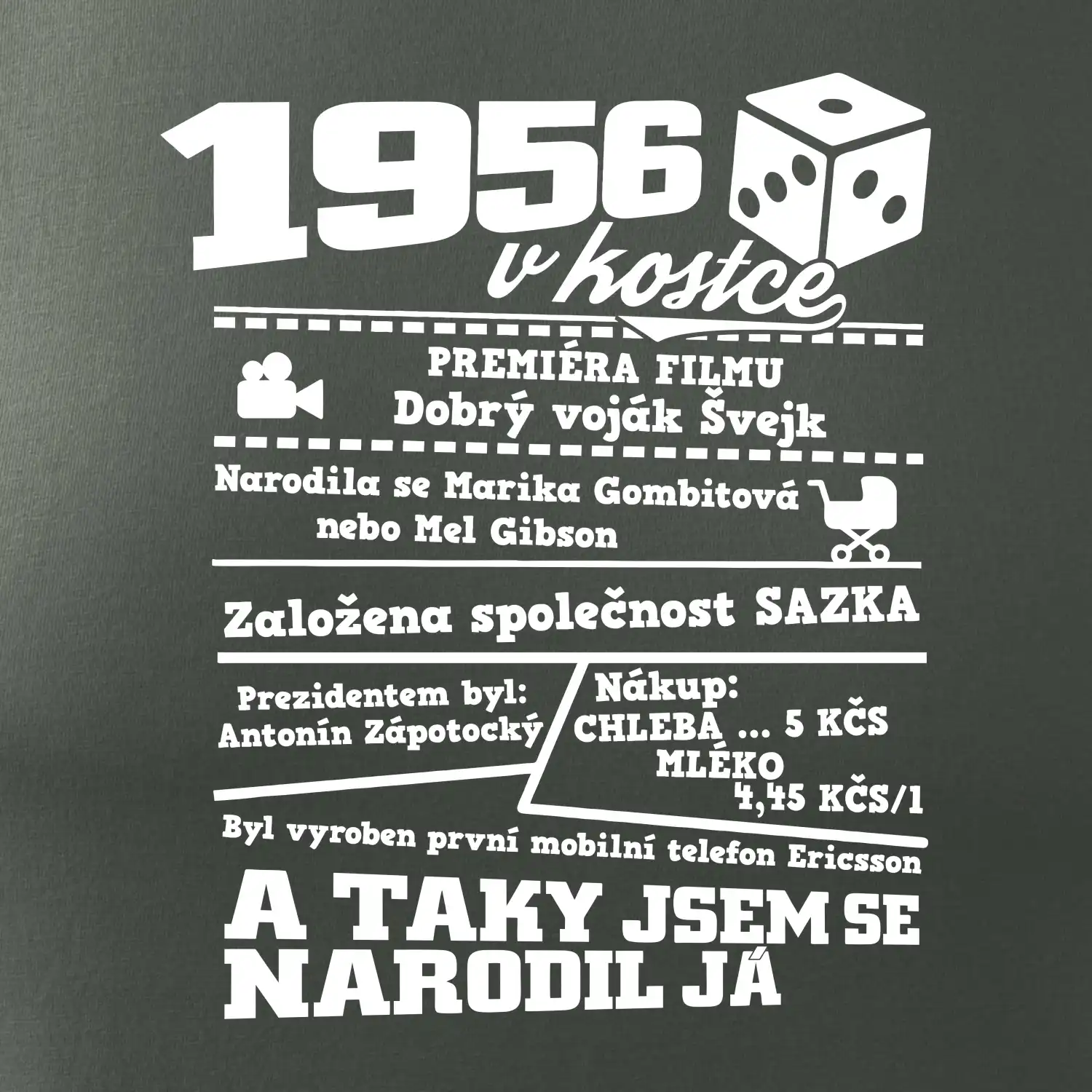 Narozeninové tričko pro ročník 1956. Sháníš originální dárek? Triko pro ročník 1956 v kostce je ten nejlepší dárek, kterým jistě potěšíš. Kolik co stálo? Kdo byl prezident? Kdo se narodil? Všechno tohle a ještě mnohem víc najdeš na našem oslaveneckém triku!
