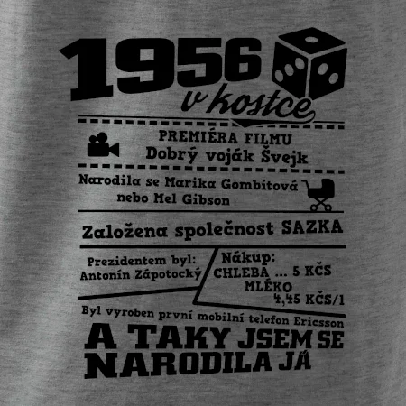 Narozeninové tričko pro ročník 1956. Sháníš originální dárek? Triko pro ročník 1956 v kostce je ten nejlepší dárek, kterým jistě potěšíš. Kolik co stálo? Kdo byl prezident? Kdo se narodil? Všechno tohle a ještě mnohem víc najdeš na našem oslaveneckém triku!