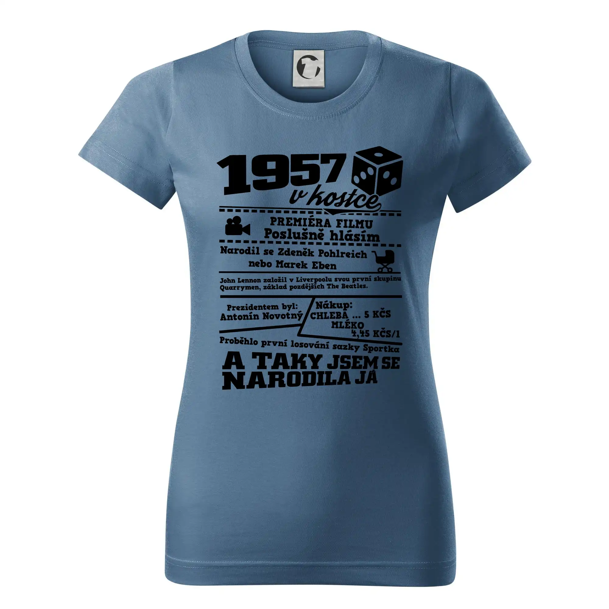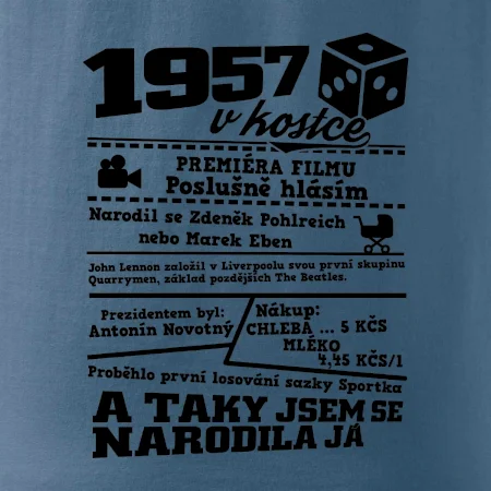 Narozeninové tričko pro ročník 1957. Sháníš originální dárek? Triko pro ročník 1957 v kostce je ten nejlepší dárek, kterým jistě potěšíš. Kolik co stálo? Kdo byl prezident? Kdo se narodil? Všechno tohle a ještě mnohem víc najdeš na našem oslaveneckém triku!