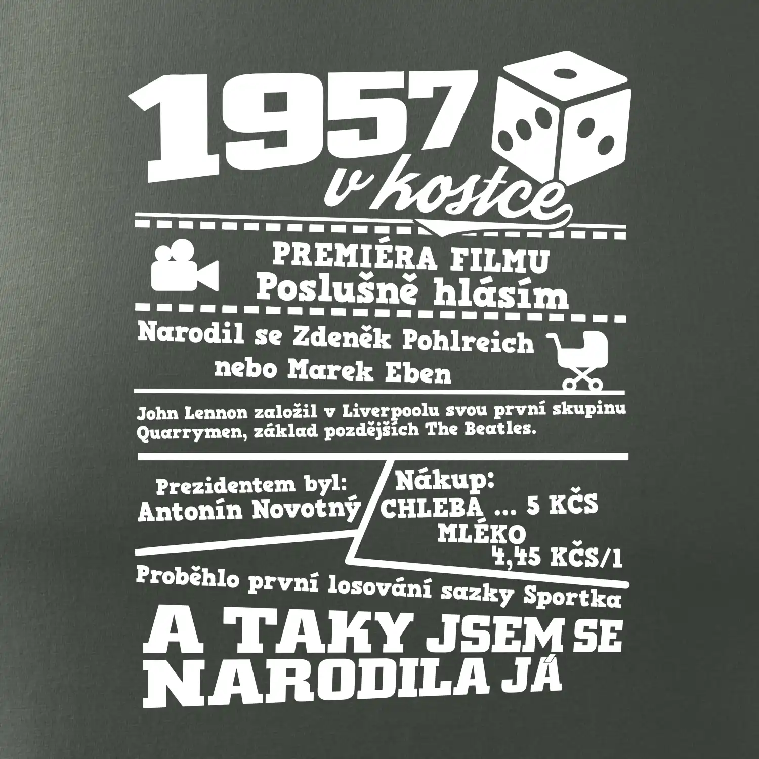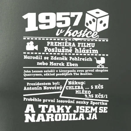 Narozeninové tričko pro ročník 1957. Sháníš originální dárek? Triko pro ročník 1957 v kostce je ten nejlepší dárek, kterým jistě potěšíš. Kolik co stálo? Kdo byl prezident? Kdo se narodil? Všechno tohle a ještě mnohem víc najdeš na našem oslaveneckém triku!