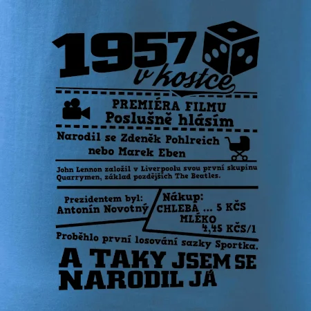 Narozeninové tričko pro ročník 1957. Sháníš originální dárek? Triko pro ročník 1957 v kostce je ten nejlepší dárek, kterým jistě potěšíš. Kolik co stálo? Kdo byl prezident? Kdo se narodil? Všechno tohle a ještě mnohem víc najdeš na našem oslaveneckém triku!