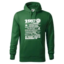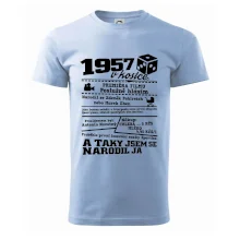 Narozeninové tričko pro ročník 1957. Sháníš originální dárek? Triko pro ročník 1957 v kostce je ten nejlepší dárek, kterým jistě potěšíš. Kolik co stálo? Kdo byl prezident? Kdo se narodil? Všechno tohle a ještě mnohem víc najdeš na našem oslaveneckém triku!