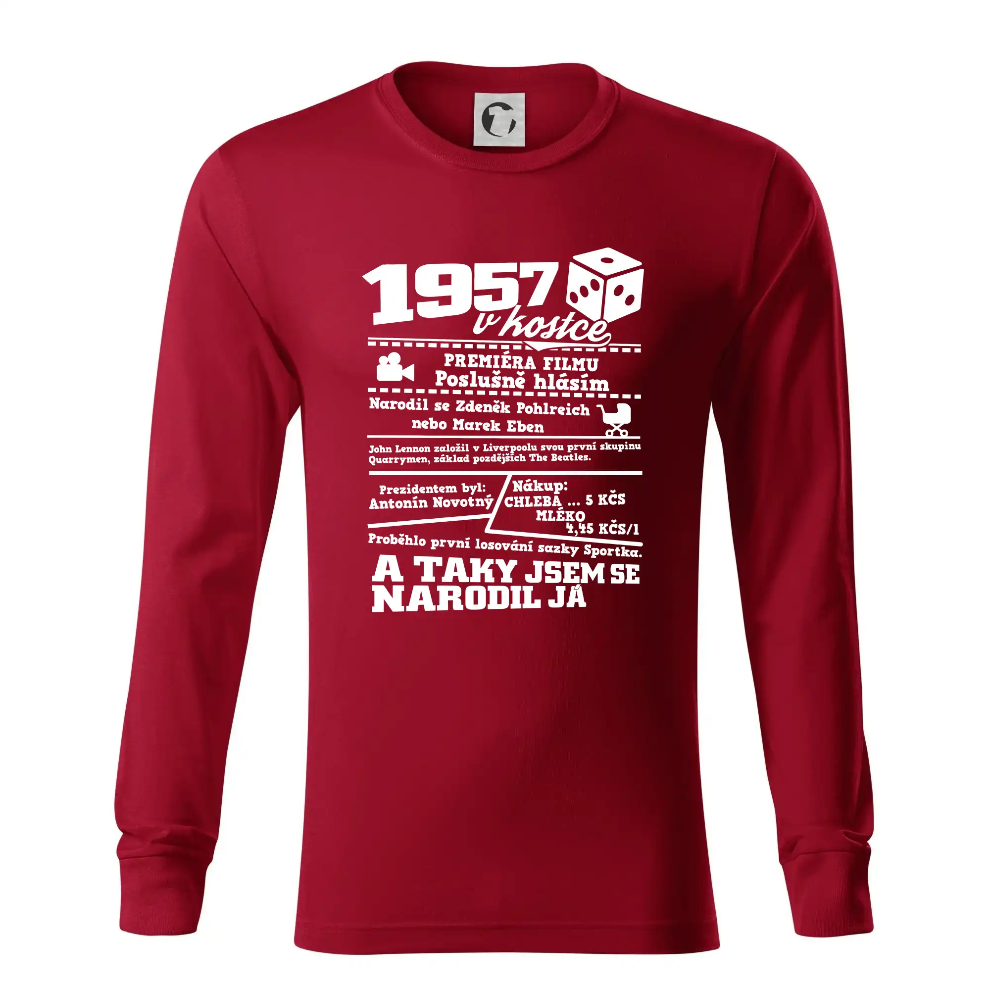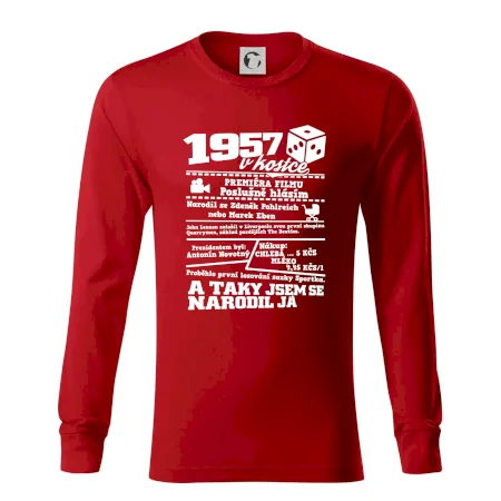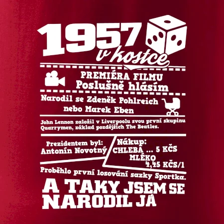 Narozeninové tričko pro ročník 1957. Sháníš originální dárek? Triko pro ročník 1957 v kostce je ten nejlepší dárek, kterým jistě potěšíš. Kolik co stálo? Kdo byl prezident? Kdo se narodil? Všechno tohle a ještě mnohem víc najdeš na našem oslaveneckém triku!