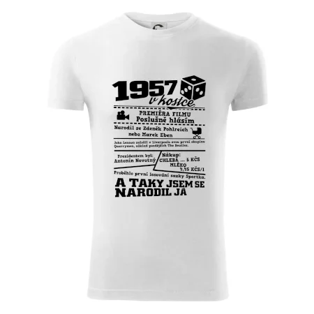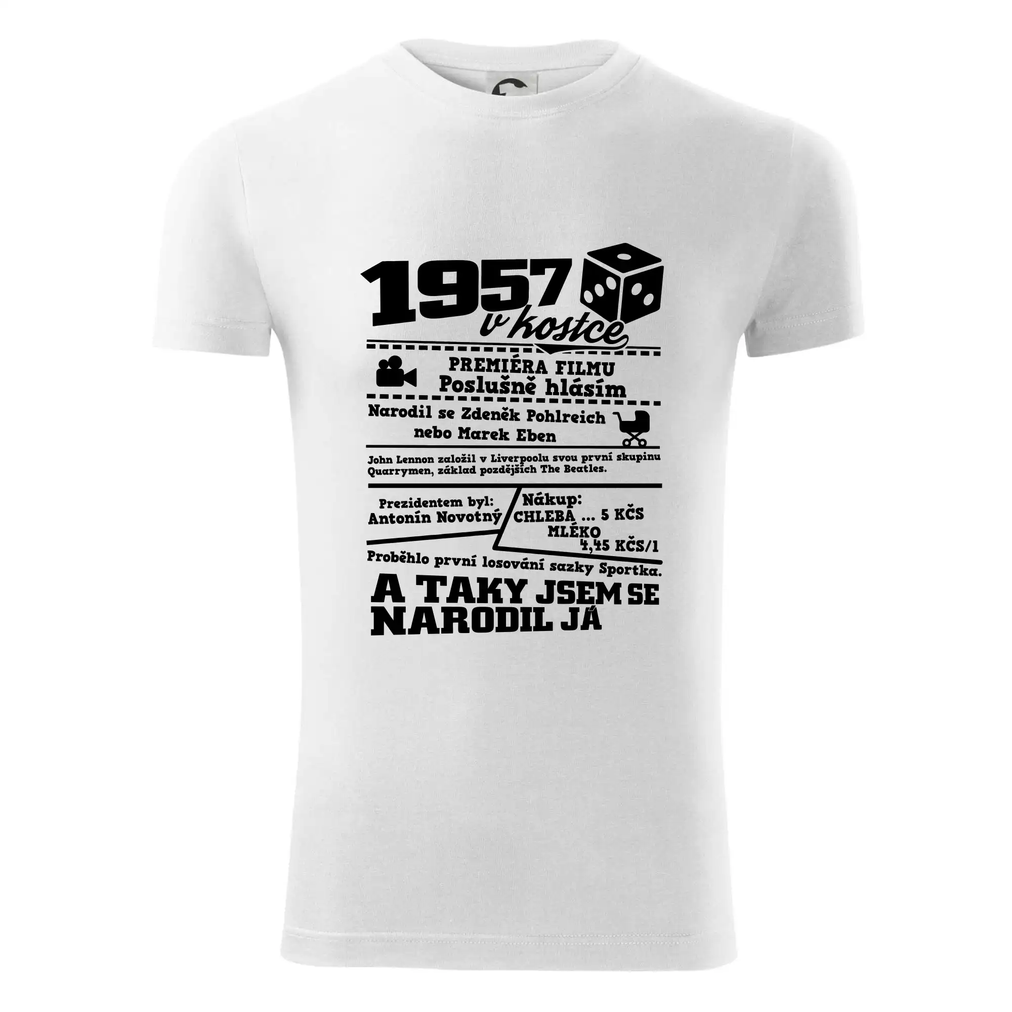 Narozeninové tričko pro ročník 1957. Sháníš originální dárek? Triko pro ročník 1957 v kostce je ten nejlepší dárek, kterým jistě potěšíš. Kolik co stálo? Kdo byl prezident? Kdo se narodil? Všechno tohle a ještě mnohem víc najdeš na našem oslaveneckém triku!