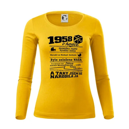Narozeninové tričko pro ročník 1958. Sháníš originální dárek? Triko pro ročník 1958 v kostce je ten nejlepší dárek, kterým jistě potěšíš. Kolik co stálo? Kdo byl prezident? Kdo se narodil? Všechno tohle a ještě mnohem víc najdeš na našem oslaveneckém triku!