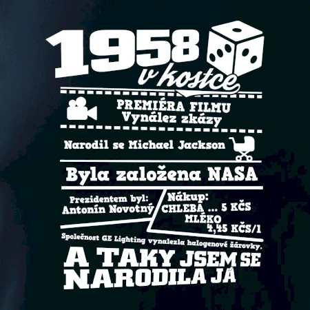 Narozeninové tričko pro ročník 1958. Sháníš originální dárek? Triko pro ročník 1958 v kostce je ten nejlepší dárek, kterým jistě potěšíš. Kolik co stálo? Kdo byl prezident? Kdo se narodil? Všechno tohle a ještě mnohem víc najdeš na našem oslaveneckém triku!